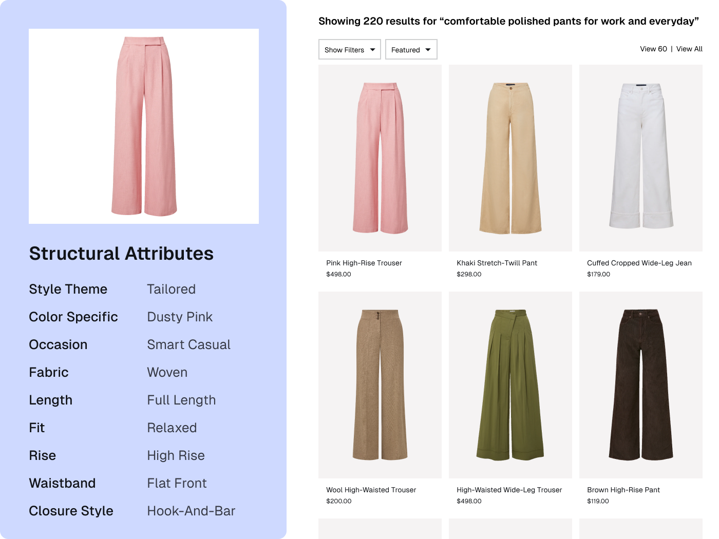 Structured attributes, detailed copy, and merchandising intelligence that improve search, filtering, and the shopping experience everywhere products appear.
