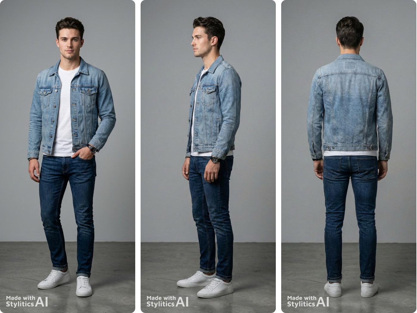 Stretch knit, woven denim, and silk all behave differently. Stylitics renders each material with the right drape and wrinkle behavior.